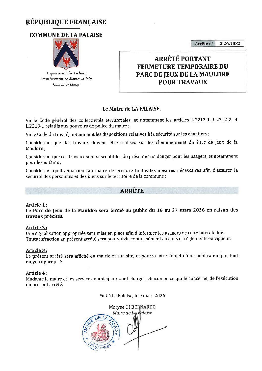 Fermeture exceptionnelle du Parc de jeux de la Mauldre du 16 au 27 mars 2026 pour travaux
